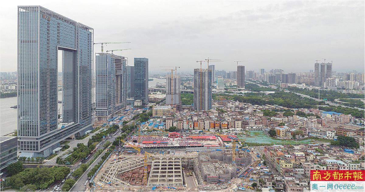 这是广州沥滘村,正后方是已经封顶的复建房,左侧是城市中轴线南端广州之窗。南都记者 黎湛均 摄