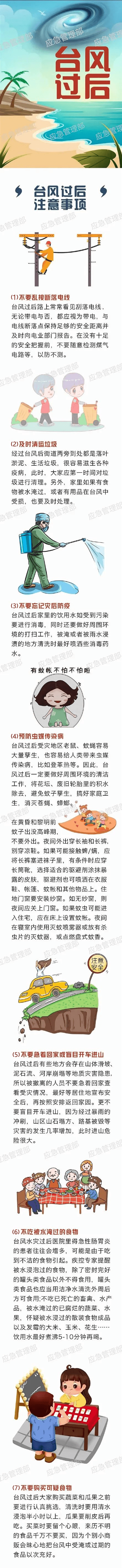 台风过境后,并不等于危险完全解除。这时,很多人因为掉以轻心而导致危险发生。还有,灾后的食品安全也不可忽视。