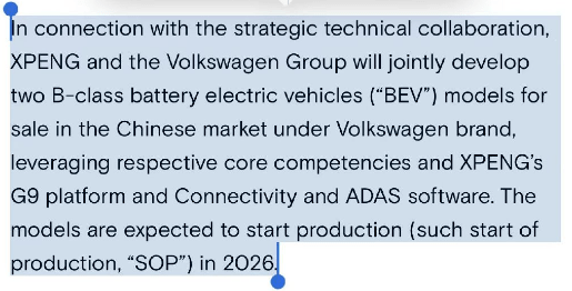 小鹏也在与大众合作的新闻稿中提到,2026年上市的两款B级纯电新车将会采用小鹏G9同款平台打造,而非小鹏最新的扶摇架构。新车还将搭载小鹏一系列的车机交互能力和ADAS软件技术,并挂上大众的标识。
