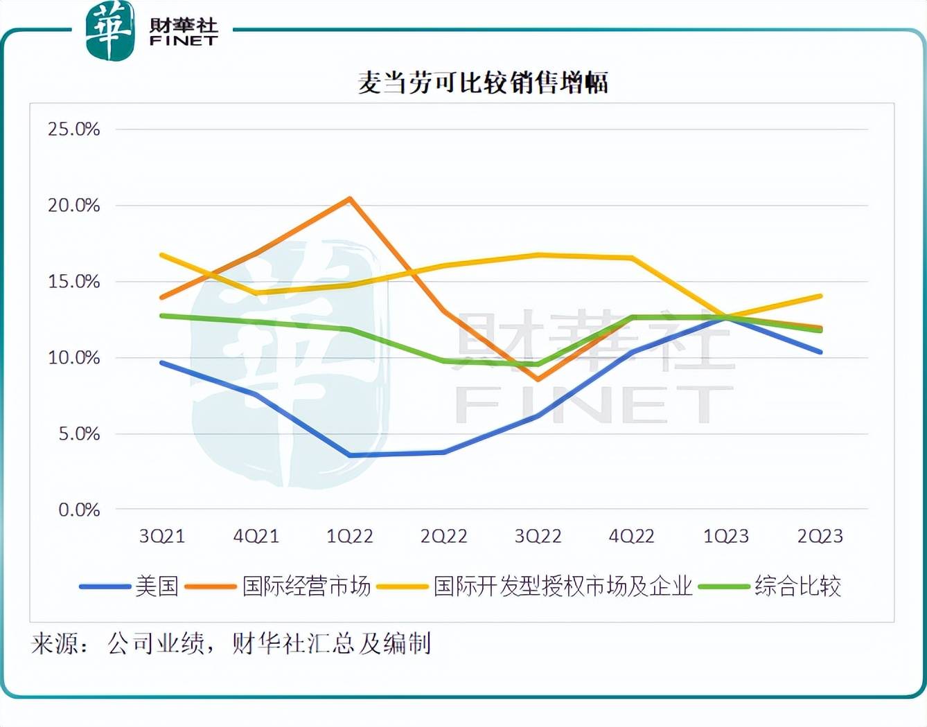 事实上,投资者或担心其最大市场美国的消费信心受到加息影响而使得麦当劳的收入增长放缓,而从以上的可比较增幅曲线可以看到,美国市场从2023年第1季的高位水平回落。
