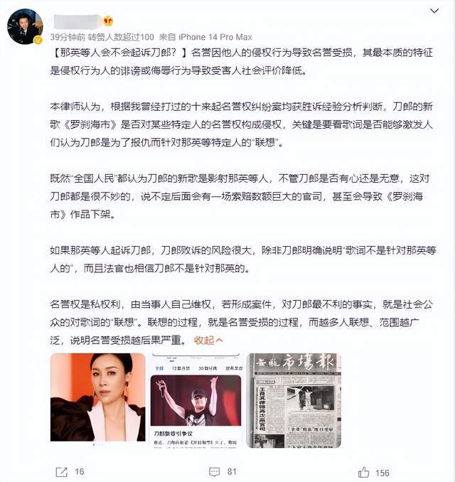 比如有律师根据自己多年打官司的经验进行分析判断,那英要是起诉刀郎的话,胜诉的概率会很大,因为名誉侵权的判定不是笼统界定的,关键要看歌词是否激发人们认为刀郎是为了报仇而针对那英产生的联想。