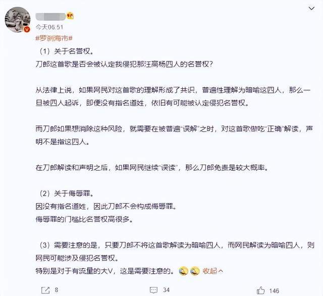 除此之外,还有律师指出刀郎新歌歌词虽然没有指名道姓,但也有可能会被认定为侵犯名誉权,因为网友已经对这首歌的理解形成了共识,普遍性理解是在内涵那英。