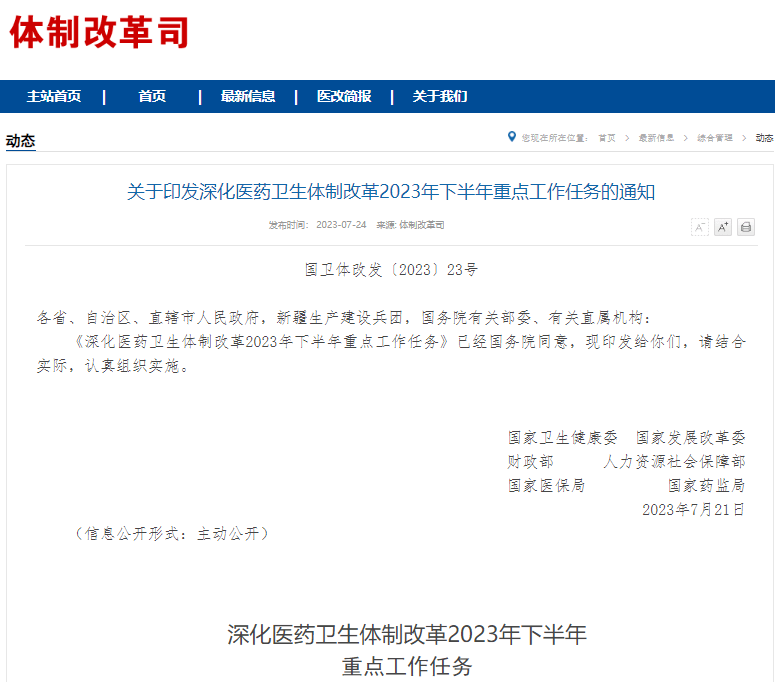 7月24日,经国务院同意,国家卫健委、发改委、财政部、人社部、国家医保局、国家药监局六部委联合印发了《深化医药卫生体制改革2023年下半年重点工作任务》(以下简称《任务》)。《任务》明确2023年下半年医改工作主要包括六个方面20条具体任务。