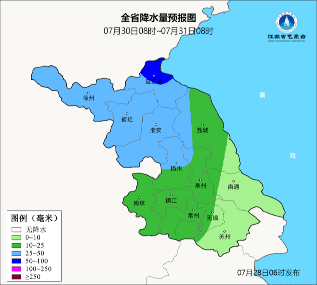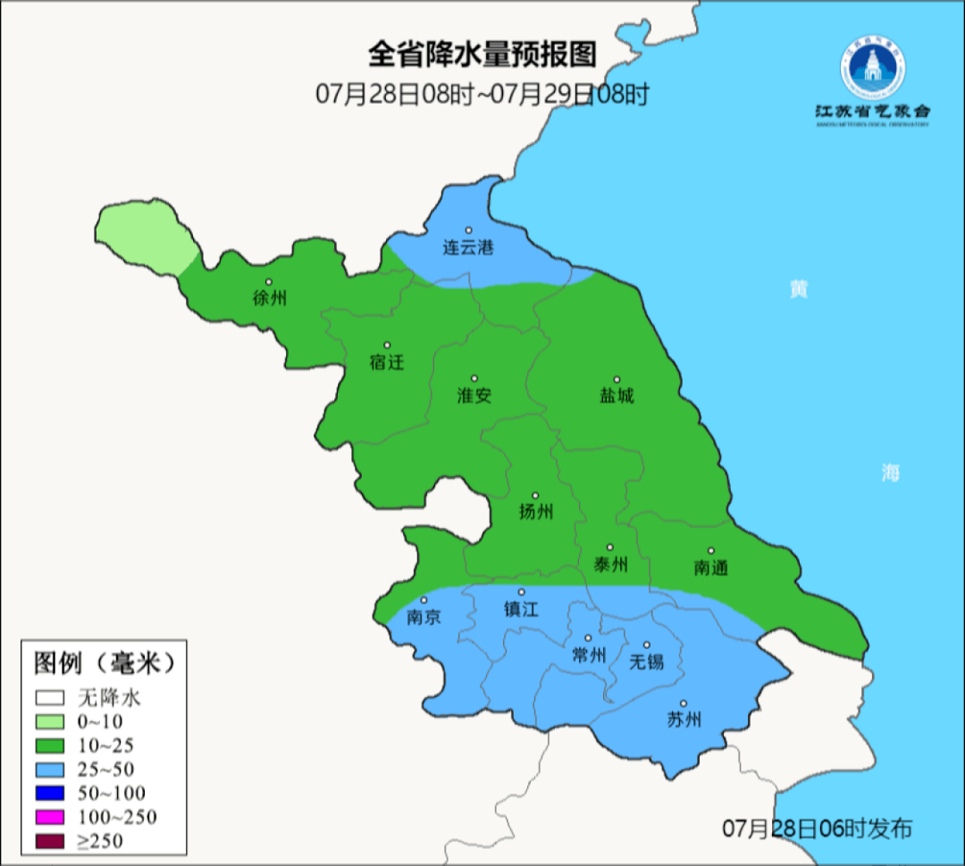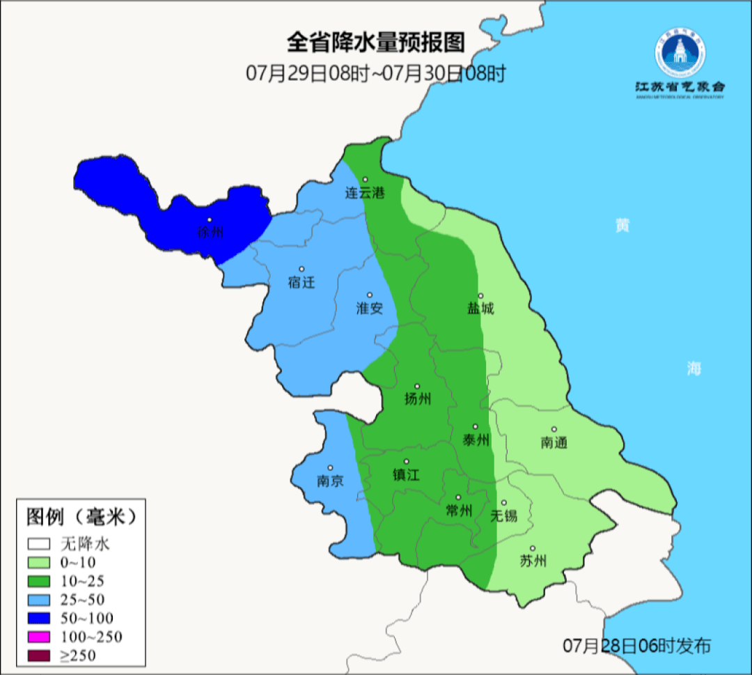 全省多云到阴有阵雨或雷雨,雨量中等,其中本省东北部和沿江苏南部分地区大雨。