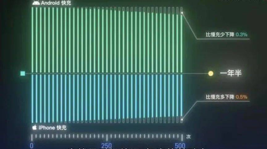 同样,在慢充和快充均达到 500 次电池循环后,安卓手机慢充和快充的电池健康度,分别下降 8.8% 和 8.5%,慢充下降得还快点。