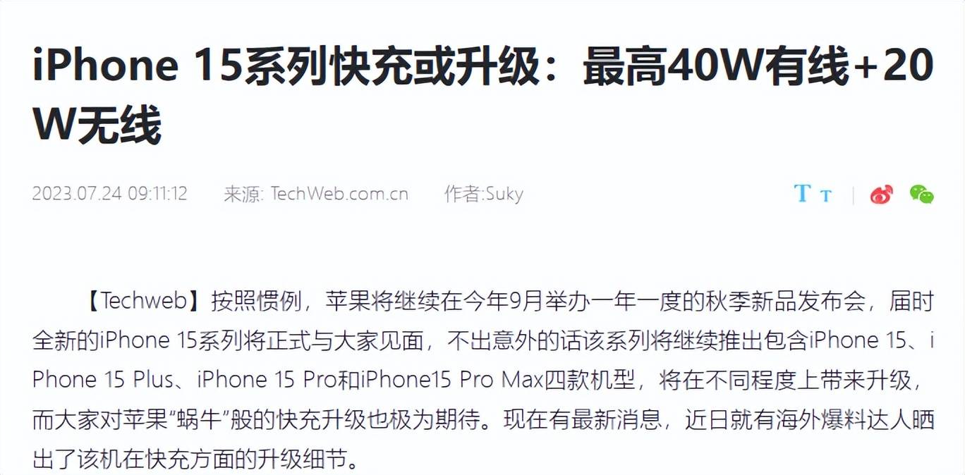 iPhone 15 系列临近发布,相关的新闻也越来越多,最近有传,iPhone 15 系列快充或升级,最高 40W 有线快充。