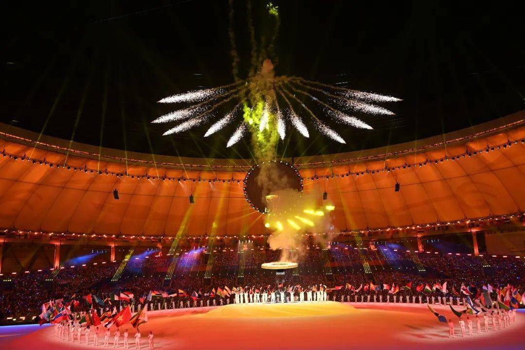 在运动员入场环节,运动员脚下的“锦绣之路”,是由投影打出的“七彩丝线”流淌到地面上,300多个环线铺满整个体育场跑道,最后逐渐变成的绚丽图案。“全世界的大学生运动员来到中国,都踏着祥云,走上‘锦绣之路’。”陈维亚表示,运动员们踏上锦绣之路,也寓意着他们的多彩青春和美好未来。