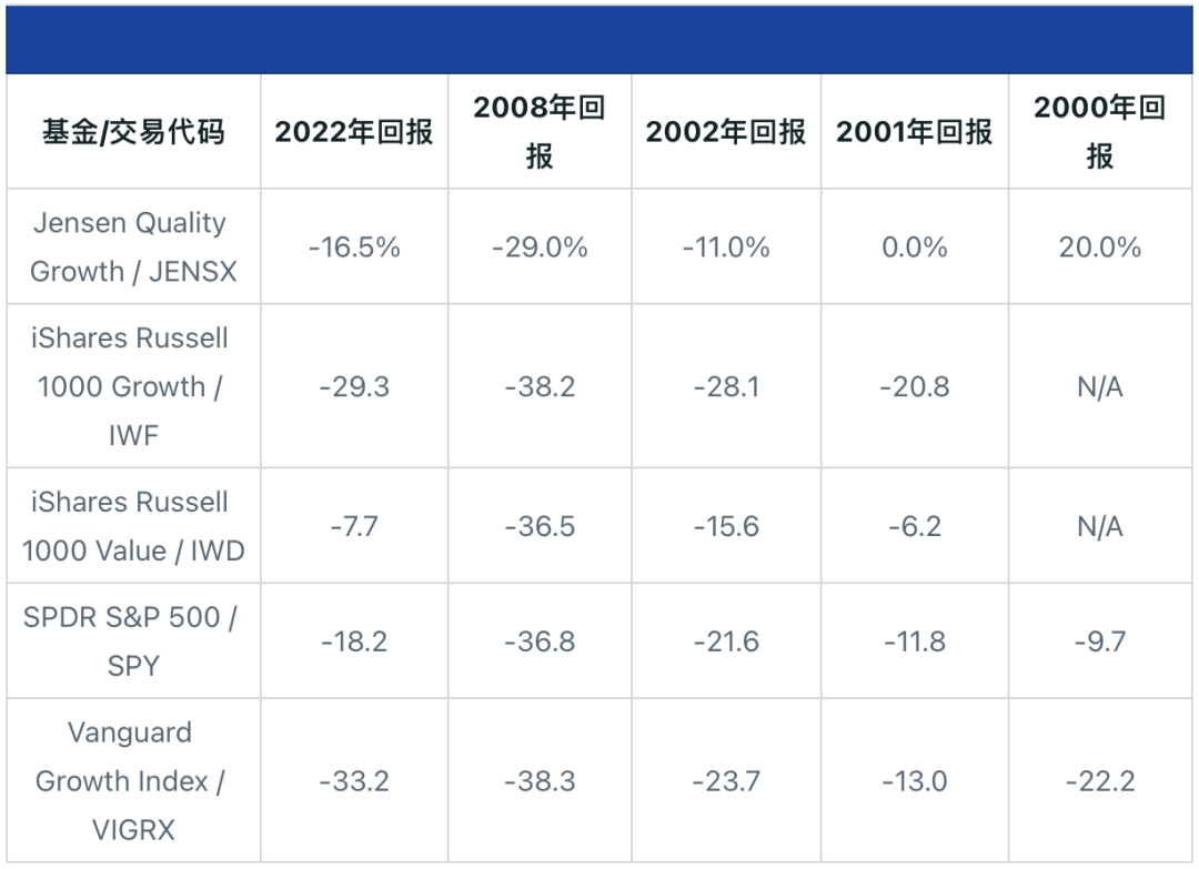 在之前几次市场低迷期,Jensen Quality Growth的表现好于指数基金