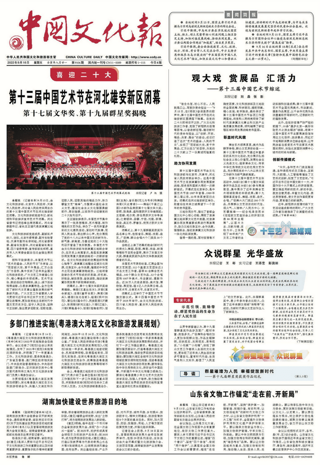 2022年,在第十三届中国艺术节宣传报道中,集团整合资源、统筹指挥,所属报、端、网、刊、研究院等内容生产部门和单位统一行动,采用“融媒体采访团+产品形态工作组”的方式协同开展策采编发工作,推出快讯、深度报道、评论、图集、长图、海报、直播、云演播、中短视频、舆情报告等多形态内容产品,并利用媒体矩阵,通过社群传播、朋友圈裂变、话题互动等多种渠道,持续扩大宣传声量,成为集团历次报道中所属媒体参与度最高、参与范围最广的一次,稿件总阅读量超过2.48亿,直播49场、观看总人次1214万,中国文化报专版数量打破创刊以来历史纪录,文旅中国新媒体有关话题4次登上微博热门话题榜。