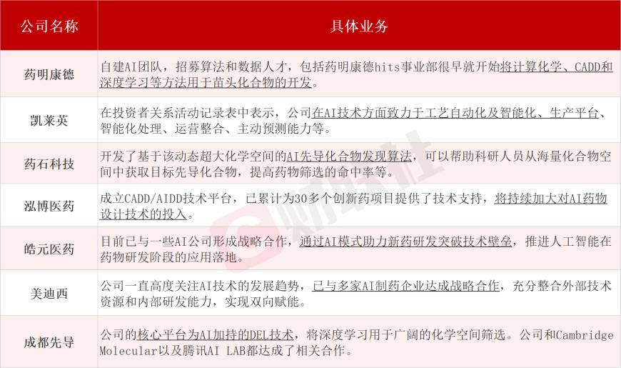 据财联社不完全统计,在AI制药领域有布局的A股CXO上市公司为药明康德、凯莱英、药石科技、泓博医药、皓元医药、美迪西、成都先导等。其中,药明康德自建AI团队,近年来开始招募算法和数据人才,包括药明康德hits事业部很早就开始将计算化学、CADD和深度学习等方法用于苗头化合物的开发。其他公司具体业务如下: