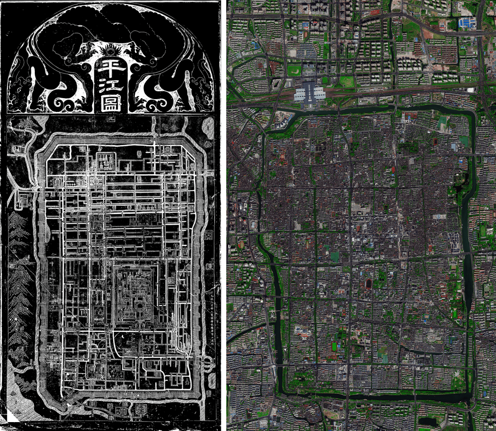 左图为宋代碑刻《平江图》(资料照片);右图为2023年3月拍摄的苏州古城的卫星图像。