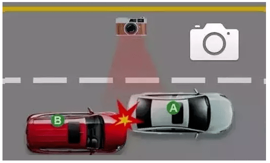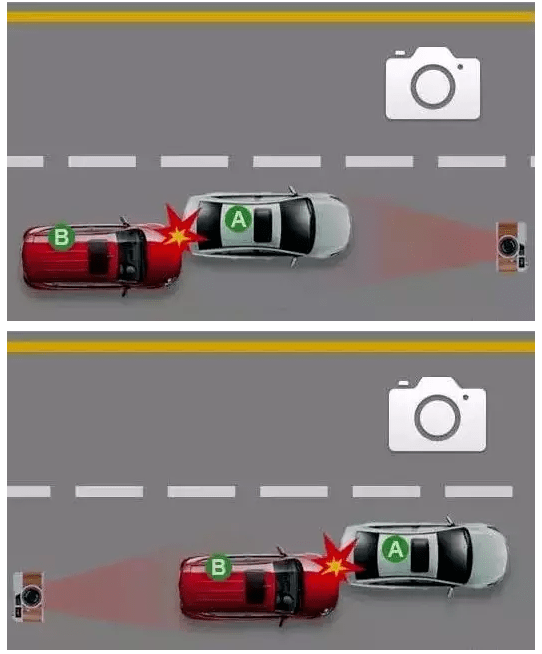 如下图所示,在机动车行驶方向前方、后方,以及碰撞部位至少各拍摄一张事故现场照片,但照片总数不超过6张。照片应当能够清晰辨别机动车号牌号码、道路标志标线。