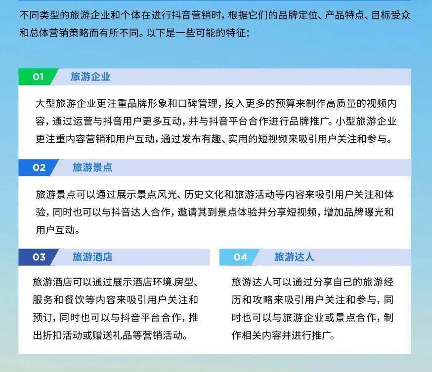 其推广打造了品效合一的营销闭环,OTA可以实现在广告形式、表达方式、传播方式、关系积累等方面的进化。抖音可以实现更短的营销链路,从表达方式、内容形式、传播方式和关系积累方面直接激发深度互动和转化,营销效果更直接。