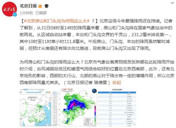 北京这场今年最强降雨还在持续。记者了解到,从31日08时至14时的降雨量来看,房山和门头沟排在国家气象站当中的前两名。从区域自动站来看,丰台和门头沟交界的千灵山,231.2毫米排名第一,其中10时至11时单小时111.8毫米。午后房山、门头沟、丰台的降雨虽然暂时减弱,但预计从南侧还有降水向北推进,目前房山门头沟又出现了降雨。