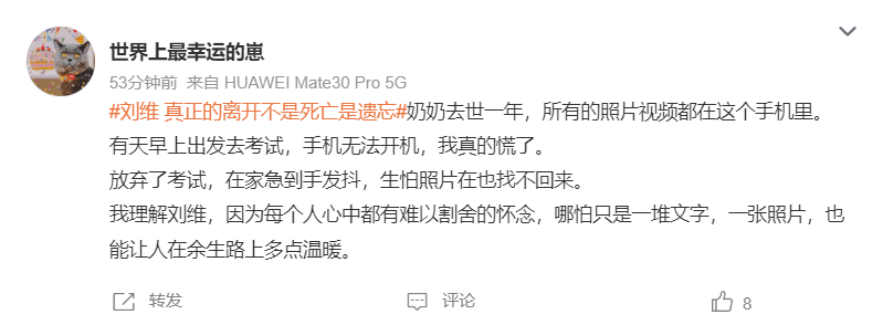 如何对待亲人的逝世是每个人都要学习的课程,每个人对待死亡都有自己的态度。刘维在此次“求助”过程中,引用了电影《寻梦环游记》中对于死亡的描述:“死亡不是生命的终点,遗忘才是。真正的死亡是世界上再没有一个人记得你。”妈妈的微信是刘维对于妈妈的念想。