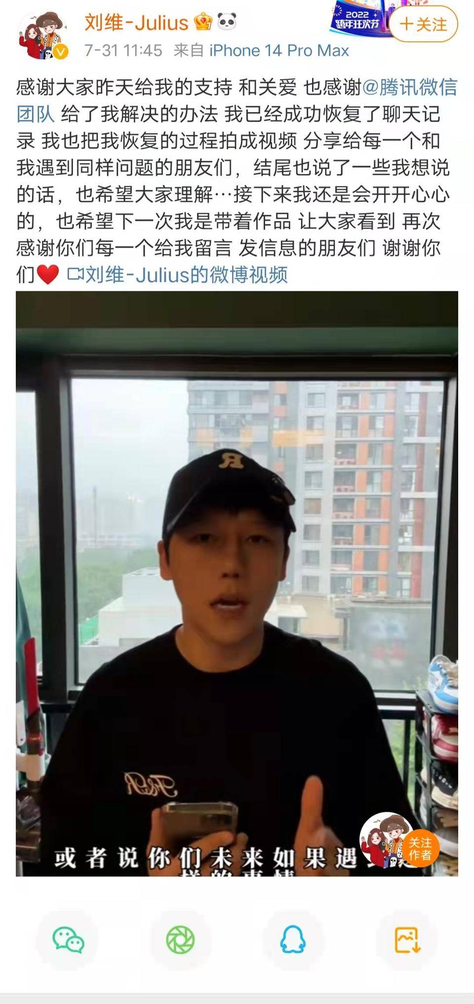7月31日,刘维再次发布微博,称在在腾讯微信团队的帮助下,已成功恢复了聊天记录,并且在7月31日中午以视频的方式向网友分享了IOS系统如何在保留聊天记录的情况下,解决微信闪退问题的操作方法。