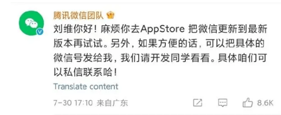 在刘维的微博发布后,腾讯微信团队在其微博评论区回应,建议他去AppStore把微信更新到最新版本再试试。