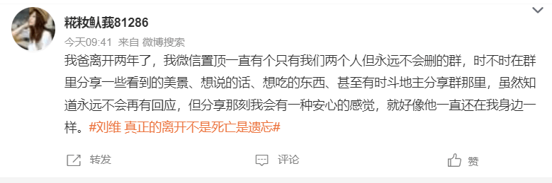 刘维此次发博寻求帮助,也引发了许多网友的共情。在这个少用书信的年代,一些聊天软件的记录,对失去亲人的人来说,有着非同一般的分量。