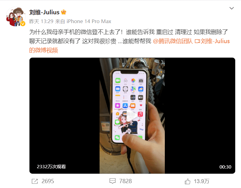 7月30日,中国内地歌手刘维发布微博求助:“为什么我母亲手机的微信登不上去了!谁能告诉我,重启过、清理过、如果我删除了,聊天记录就都没有了,这对我很珍贵…谁能帮帮我!”并@腾讯微信团队。