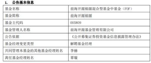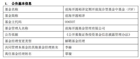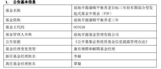 前海开源基金管理有限公司发布基金经理变更公告,前海开源康颐平衡养老三年(007638)、(005809)、前海开源裕泽(006507)增聘李赫,覃璇离任。