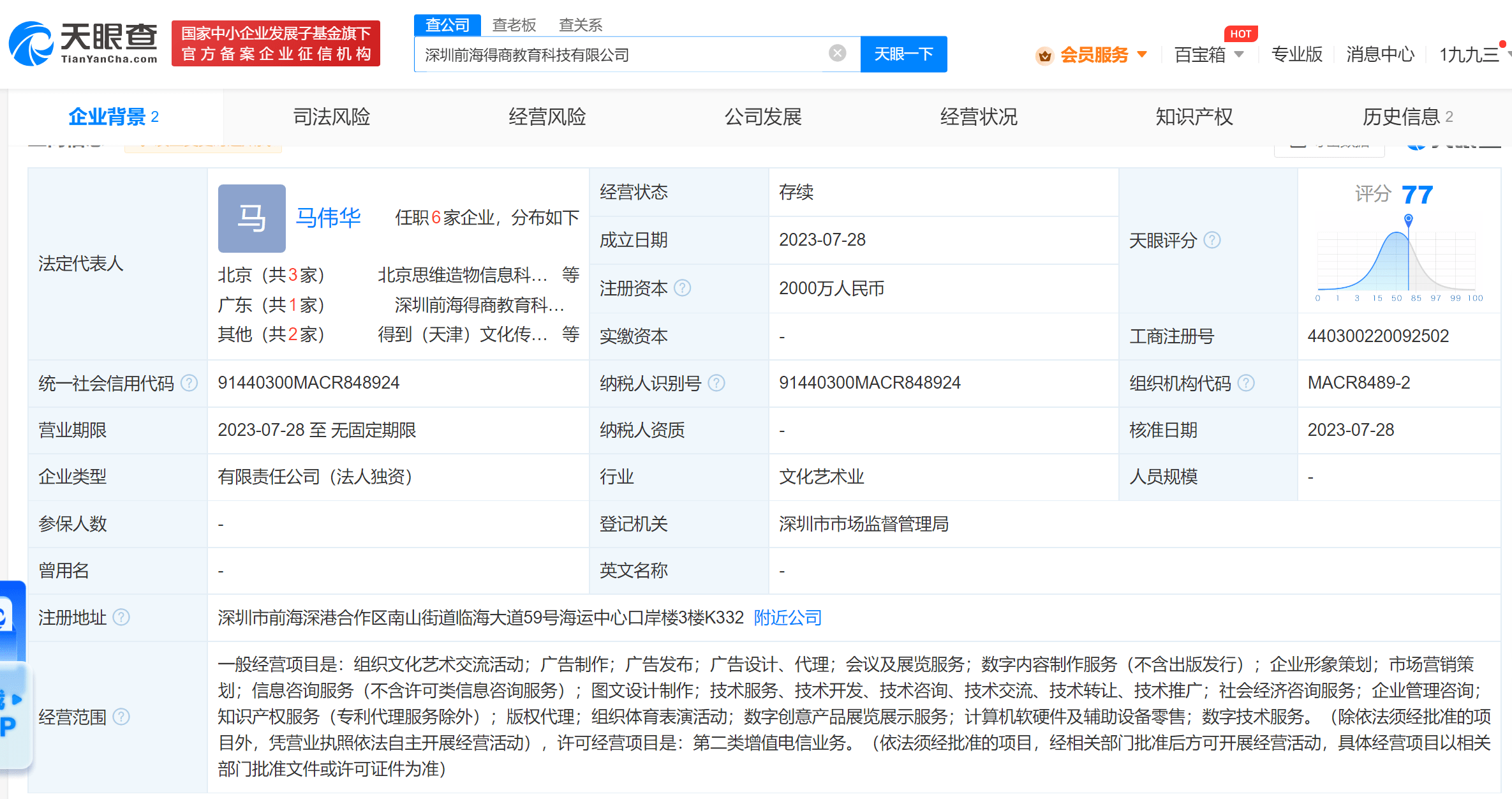 天眼查App显示,近日,深圳前海得商教育科技有限公司成立,法定代表人为马伟华,注册资本2000万人民币,经营范围含组织文化艺术交流活动、数字内容制作服务、企业形象策划、社会经济咨询服务、组织体育表演活动等。股东信息显示,该公司由得到关联公司北京思维造物信息科技股份有限公司全资持股。