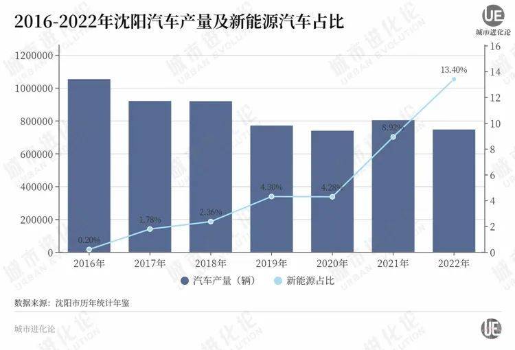 依托这些龙头车企,沈阳在燃油车时代一度风光无两,成为继上海、重庆、长春等城市之后,全国第七个年产汽车超百万辆的城市。直到2016年,沈阳的汽车产量仍然保持在105万辆,其中宝马牌、中华牌合计占据45%的份额。