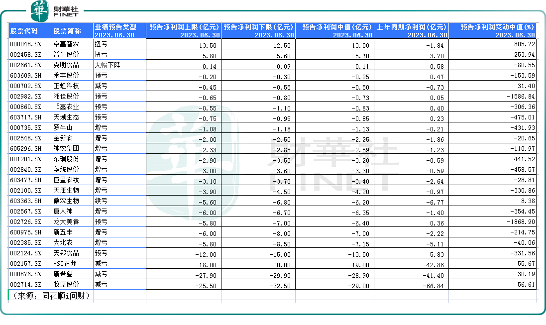 这自然也导致相关公司的业绩承压。截至目前,共有24家上市猪企公布了2023年上半年的业绩预告,财华社根据同花顺i问财数据统计,梳理如下。