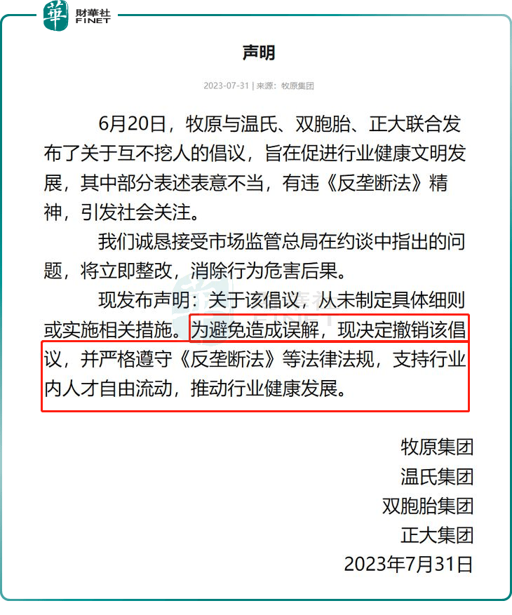 7月31日,国家市场监管总局约谈了牧原股份、温氏股份、双胞胎、正大投资等四家生猪养殖巨头。市场监管总局认为,四家企业作为发起人,签署《互不挖人公约》,倡议不挖人、不拆台等,有违《反垄断法》精神,不利于构建全国统一大市场。被约谈后,四家公司随即发布联合声明,表示“认错”并整改。