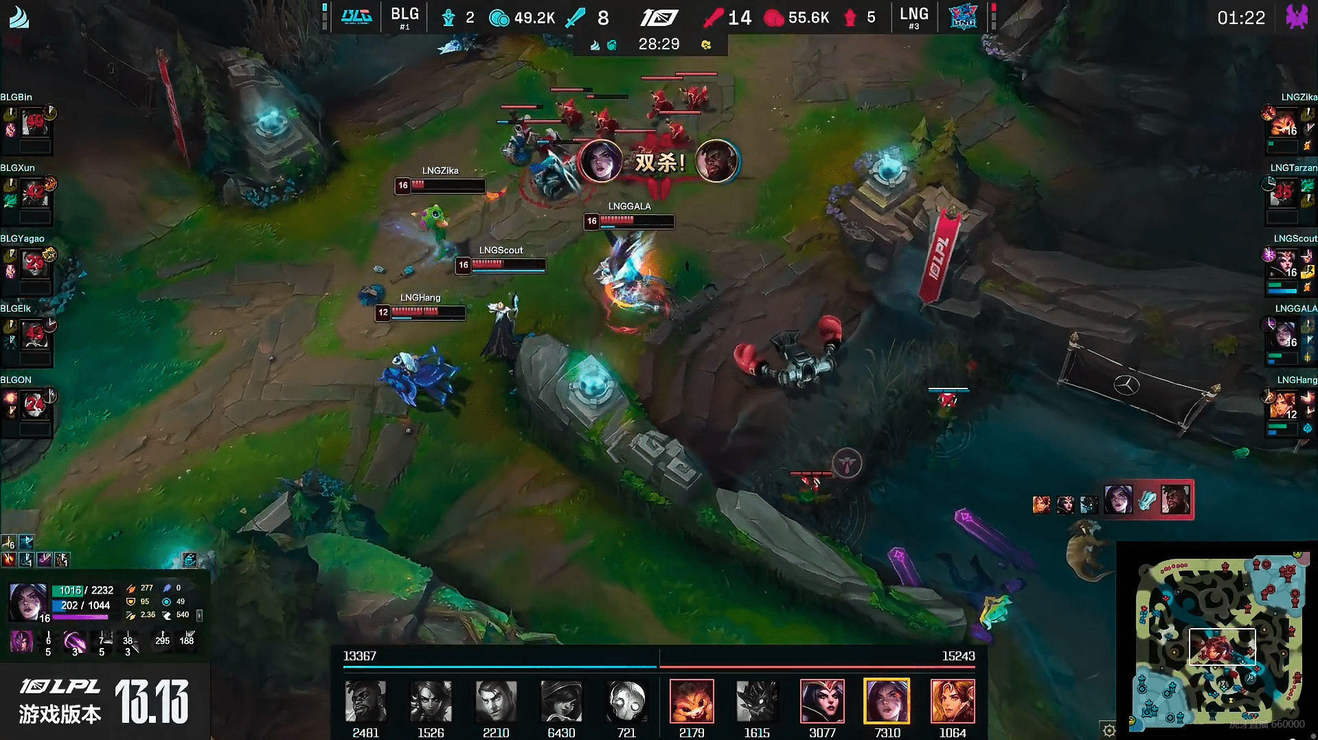 比赛12分钟LNG下路越塔将ElkEZ击杀,猪妹来到下路支援也被击杀。BLG拿下二先锋,LNG则是接连控下两条小龙。在下路19分钟,LNG的小炮收掉BLG沙皇的人头。