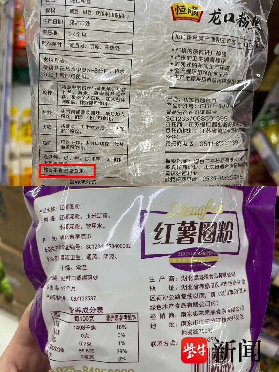 记者探访:含有绿豆成分的粉丝品种多印有“不宜空腹食用”的提示