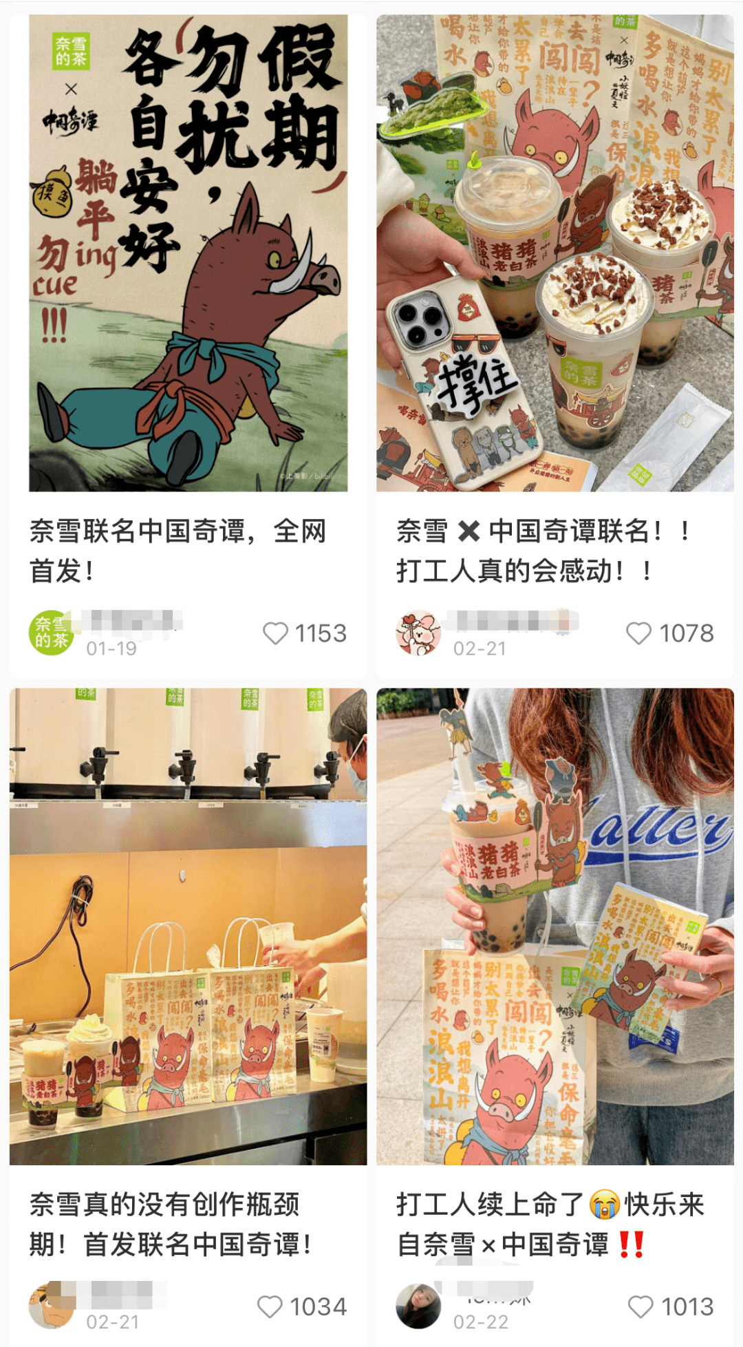 与《中国奇谭》的合作格外契合“国潮文化”定位属性,奈雪以“小猪妖的春天,翻过浪浪山”为主题,使用业内少见的福建茗茶作为茶底,推出“猪猪老白茶”系列新品。