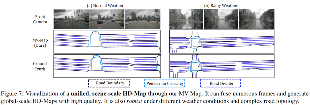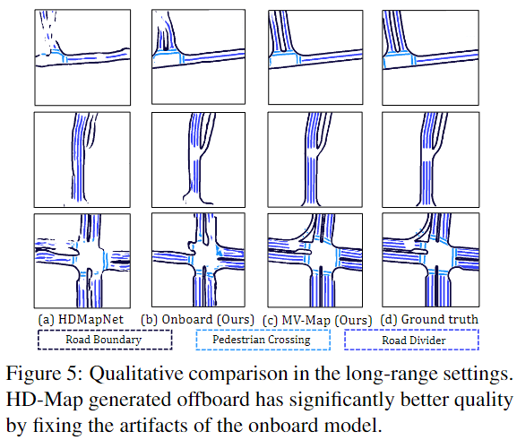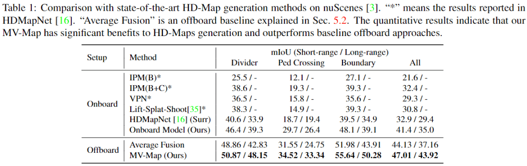 由于我们的工作代表了对非车载高精地图生成的首次研究,因此没有现成的竞争方法。此外,MV-Map可以使用任何现成的车载模型作为其内部组件。为了确保有意义和公平的比较,将下表1中的实验结果和分析整理如下。
