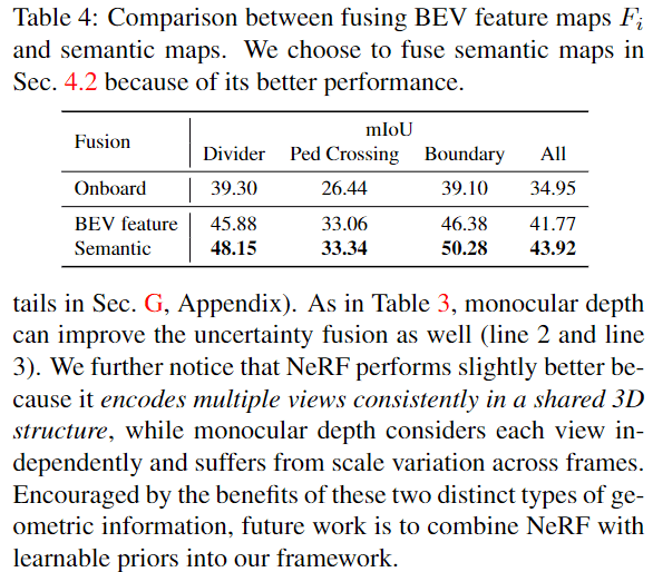 融合语义与BEV特征。以区域为中心的框架对语义图 而不是BEV特征 执行加权平均。在下表4中,证明了我们的设计选择,其中融合BEV特征比融合语义图更糟糕。主要原因是当有大量的非车载数据输入帧时,训练和推理之间的域转换。此外,模糊BEV特征也不太实用,因为需要显著更多的磁盘空间来存储高维特征。