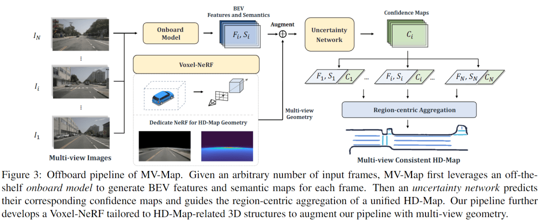 我们提出了一种新的非车载高精地图生成设置,以解决车载BEV感知的不可靠性问题。通过消除计算约束,模型可以完全再现所有帧,并构建多视图一致的高精地图。具体来说,提出了一个非车载高精地图生成框架,称为MV-Map。为了处理多帧,MV-Map设计了以区域为中心的聚合,以统一所有帧的HD Map。关键设计是一个不确定性网络,该网络衡量不同帧的贡献,并利用体素NeRF提供多视图一致的3D结构信息。经验表明,MV-Map可扩展到大量非车载数据,并显著提高了HD Map的质量。希望MV-Map框架能够成为车载算法的有效补充器,并启发未来对非车载问题的研究。