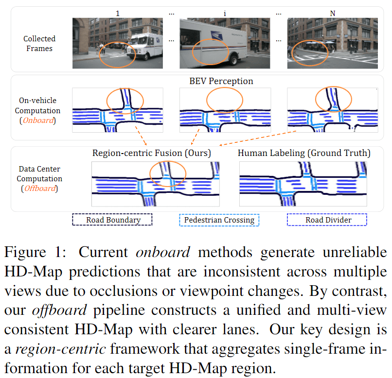 非车载设置与车载设置。与传统的车载设置相比,我们的非车载设置在速度和计算资源方面提供了更大的灵活性。车载高精地图生成算法经常受到效率要求的限制,不能在一次运行中使用所有的N帧。相比之下,非车载算法可以访问所有N帧,然后可以利用非车载设置和丰富的计算资源来生成更高质量的高精地图。从以框架为中心到以区域为中心的设计。有不同的策略来利用来自N帧的时间数据,类似于非车载3D检测。直接解决方案是以帧为中心的,其中我们显著增加了现有车载HD Map构建方法(通常是BEV分割模型)的帧数,并将其扩展为长序列。虽然先前的工作已经说明了较长时间范围的好处,但多帧BEV分割模型只能处理固定数量的输入帧,并且增加帧数量需要GPU容量的线性增长。因此,简单地放大现有车载模型的输入帧并不是利用车载数据的有效方法,车载数据通常具有不同的大帧数。为了克服以帧为中心设计的局限性,我们提出了一种新的以区域为中心的设计,该设计针对每个HD Map区域自适应地从任意数量的可用帧中分离信息。我们的设计灵感来自3D检测中以目标为中心的概念,但扩展到了HD Map构建的任务。这样做可以实现从不同角度拍摄的跨帧视觉效果。