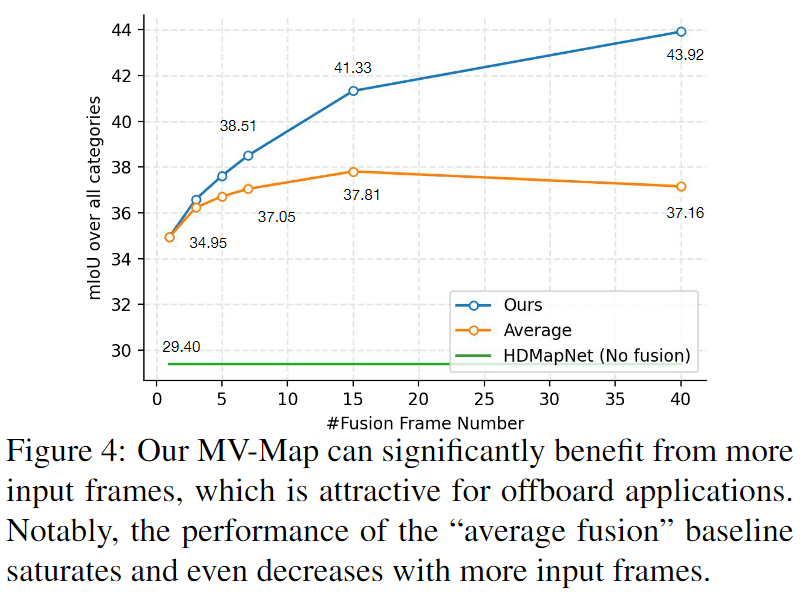 MV-Map可以利用nuScenes中的所有关键帧(40帧),并且该数字仅受序列长度的限制。如上图4的蓝色曲线所示,MV-Map受益于更多的帧,这表明其在非车载场景中的可扩展性,特别是与平均融合基线相比,平均融合基线在使用超过15帧后性能下降。这表明,我们以区域为中心的融合策略能够识别帧之间的互补区域,而不是盲目地对它们进行平均。