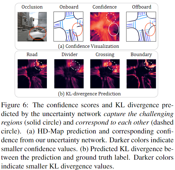 分析KL散度和置信度得分。我们对下图6中的不确定性网络的输出进行了实证分析。至于置信度得分,观察到它们实际上降低了不可靠区域的贡献,例如图6a中有遮挡的部分,用实点高亮。此外,将KL散度预测头转移到验证集,并发现预测合理地反映了预测和真值之间的差异,如图6b所示。进一步注意到,具有较高KL散度值的区域(图6a)也具有较低的置信度(图6b),用虚线圆突出显示。