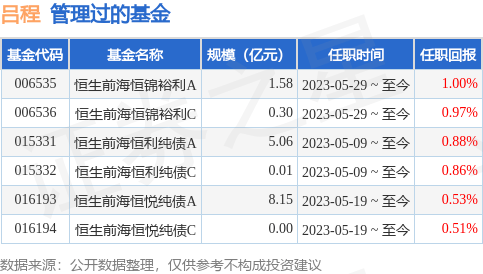 吕程先生:中国国籍,金融工程学硕士。曾任恒生前海基金管理有限公司固定收益部债券研究员,恒生前海短债债券型发起式证券投资基金基金经理助理,恒生前海基金管理有限公司集中交易部债券交易员,中国光大银行烟台支行投资银行部产品经理。现任恒生前海恒利纯债债券型证券投资基金基金经理。2023年5月9日任恒生前海恒利纯债债券型证券投资基金基金经理。2023年05月19日担任恒生前海恒悦纯债债券型证券投资基金的基金经理。2023年05月29日起任恒生前海恒锦裕利混合型证券投资基金基金经理。