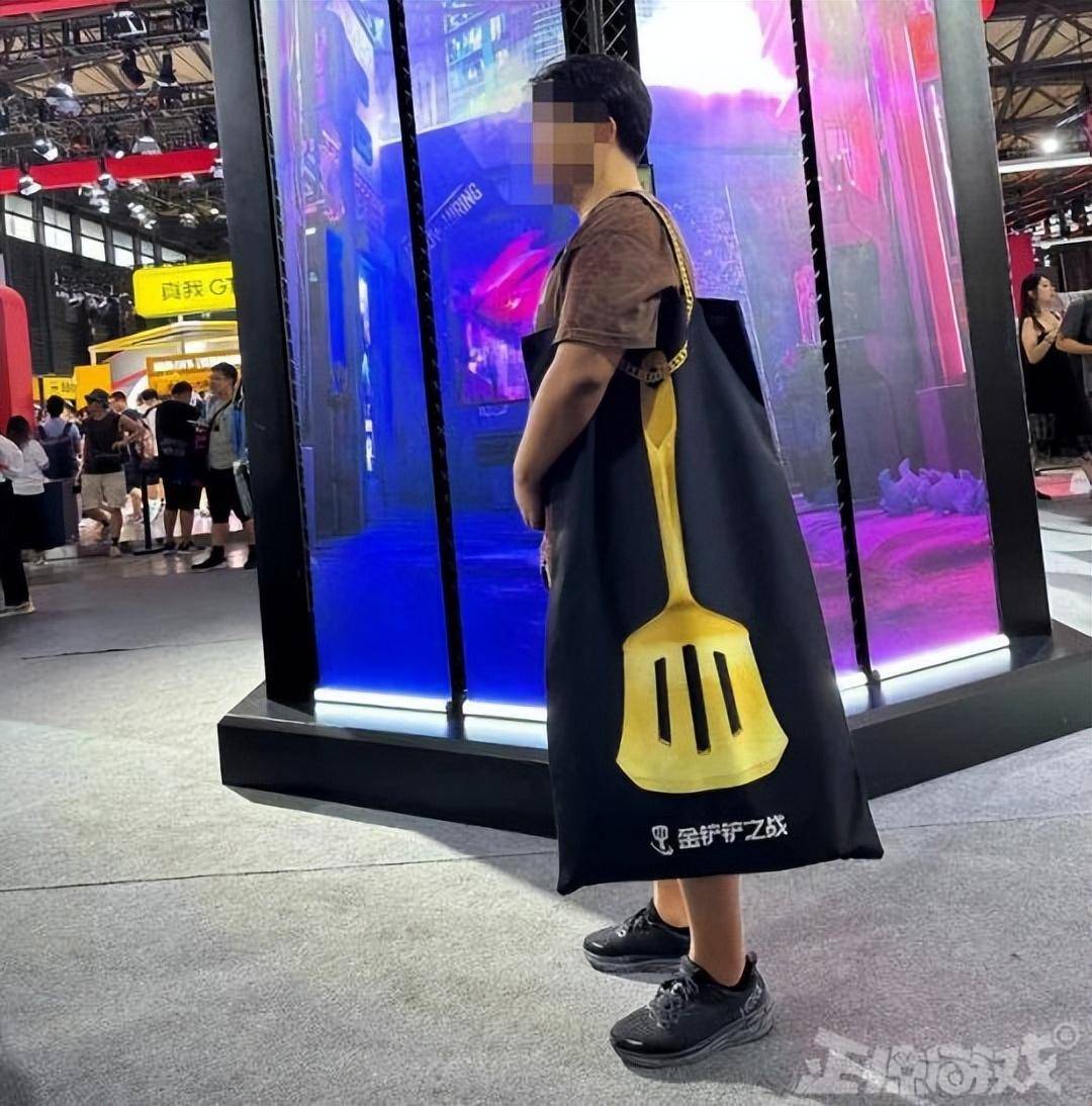 大家的包包要么是圆的要么是接近正方形的款式,而腾讯的《金铲铲之战》就剑走偏锋,搞了一个长方形的,上面还印刷了一个巨大的金铲。
