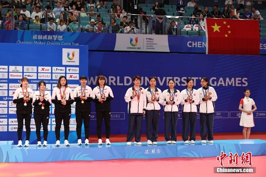 8月1日,第31届世界大学生夏季运动会乒乓球女子团体决赛在四川成都举行,中国队以总比分3:2战胜日本队,夺得金牌。图为中国队团队成员在颁奖仪式后合影。中新社记者 韩海丹 摄