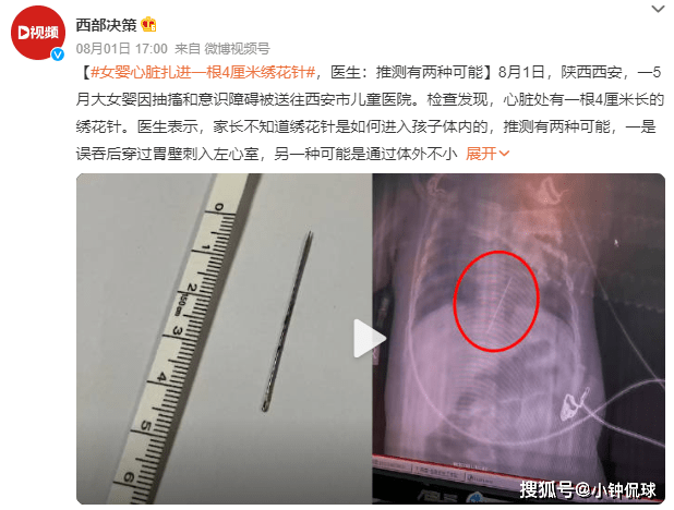 2023年8月1日,陕西西安市儿童医院发生一起令人震惊的事件。一名仅5个月大的女婴因经常抽搐和意识障碍而被紧急送往医院。经过仔细检查,医生们发现了一个惊人的事实:女婴的心脏里竟然插着一根长达4厘米的绣花针!