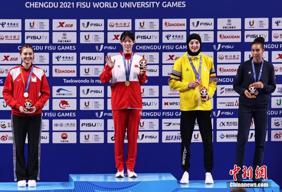 宋洁(左二)与获得银牌的土耳其选手KAYIR Lkra(左一)、获得铜牌的比利时选手CHAARI Sarah(左三)和法国选手HADDAD Khalida(右一)选手站在领奖台上。中新社记者 王磊 摄