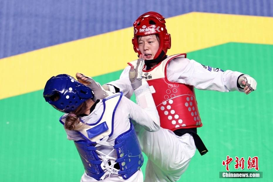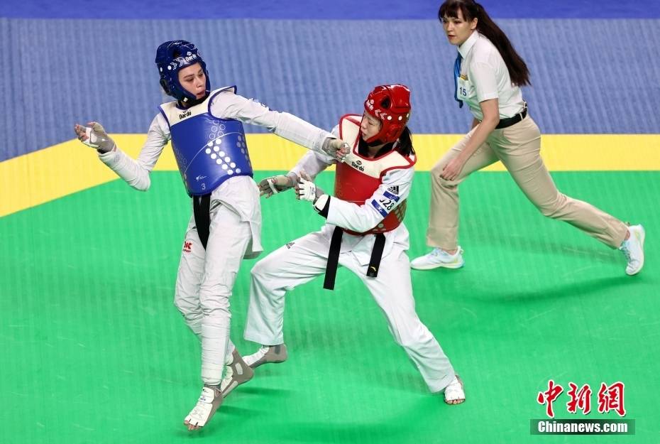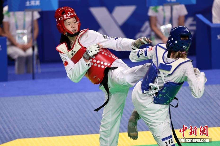 8月1日,第31届世界大学生夏季运动会跆拳道项目女子67公斤级决赛在成都举行,中国选手宋洁(红衣)战胜土耳其选手KAYIR Lkra,夺得金牌。图为宋洁与土耳其选手KAYIR Lkra在比赛中进攻。中新社记者 王磊 摄