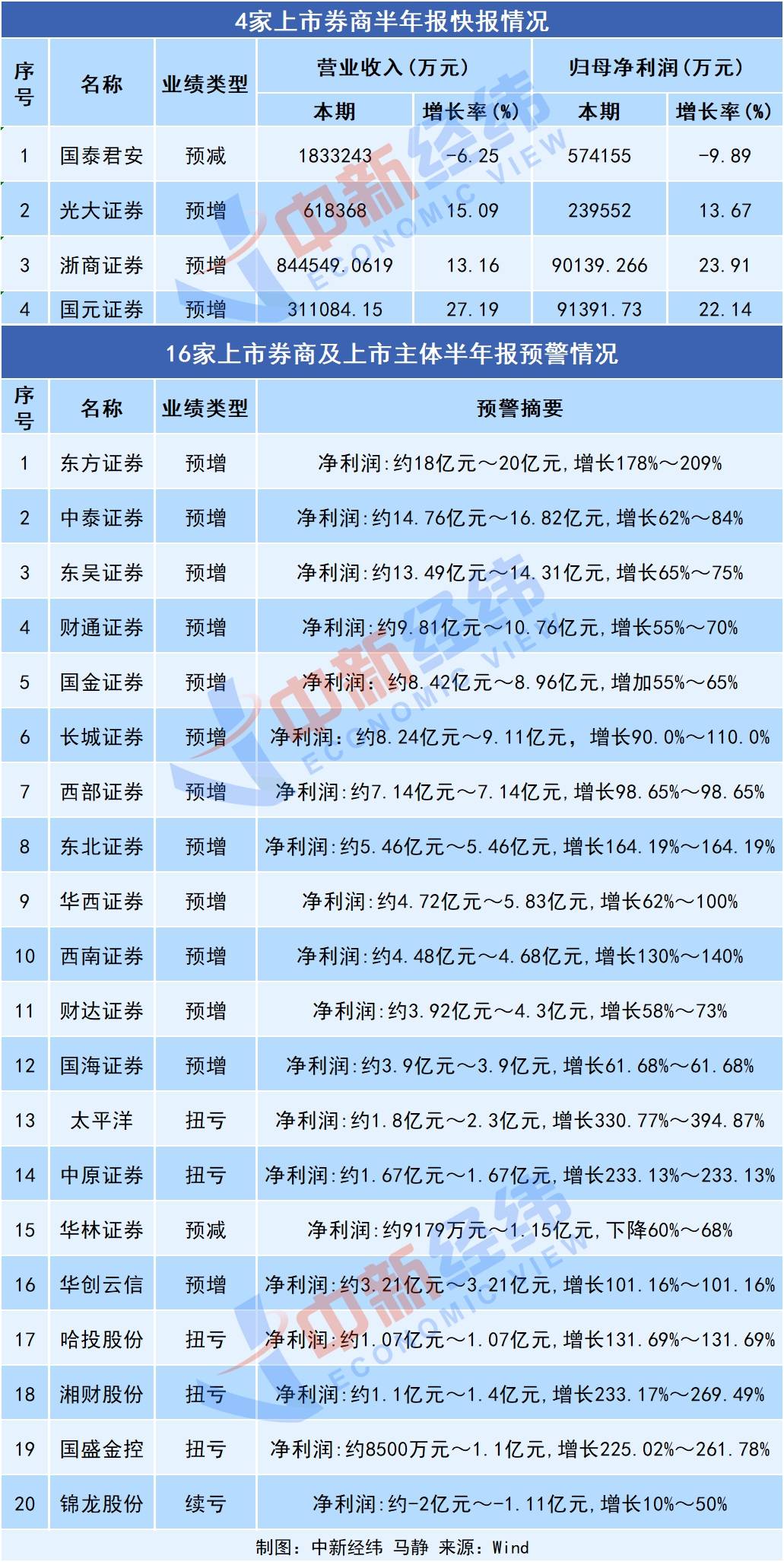 归纳各家业绩预喜券商发布的公告,上半年业绩大增主要跟其主动调整资产结构、自营业务回血相关,光大证券、国元证券、中泰证券等17家券商均提到该点。比如,国元证券在报告期内,投资收益(含公允价值变动收益)比上年同期增加7.05亿元,抵减部分业务收入下降和利息支出增加等因素后,上半年实现营业收入和归属于股东的净利润分别较上年同期增长27.19%和22.14%。