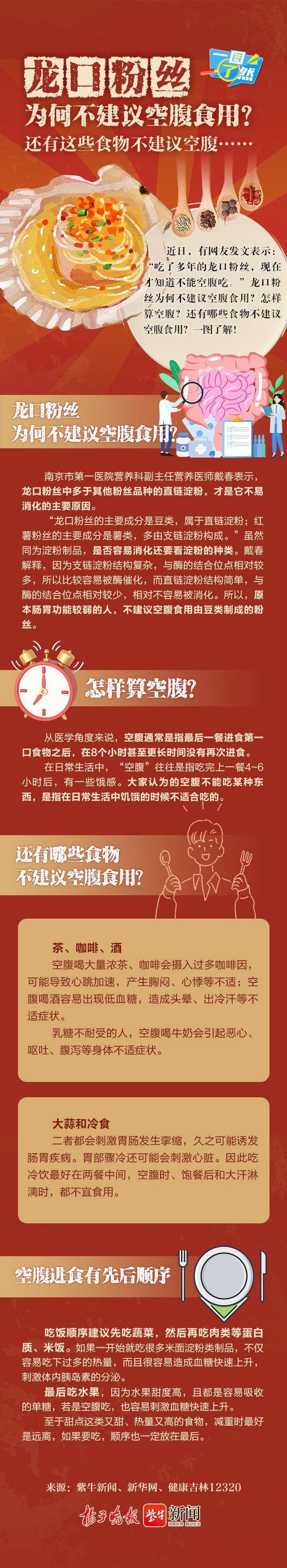 近日,有网友发文表示:“吃了多年的龙口粉丝,现在才知道不能空腹吃。”龙口粉丝为何不建议空腹食用?怎样算空腹?还有哪些食物不建议空腹食用?一图了解!