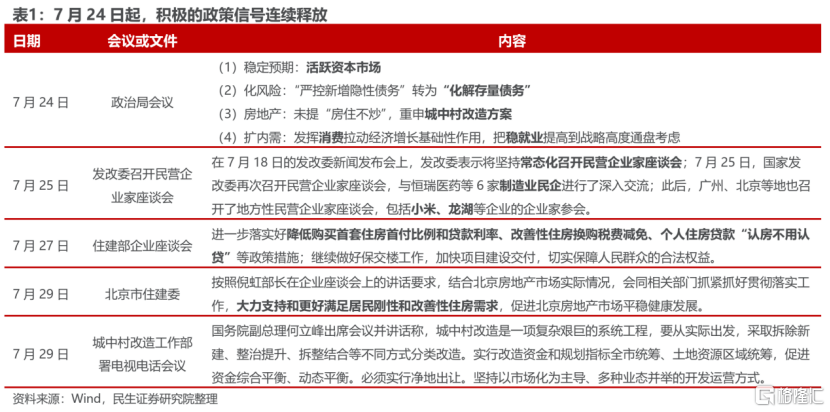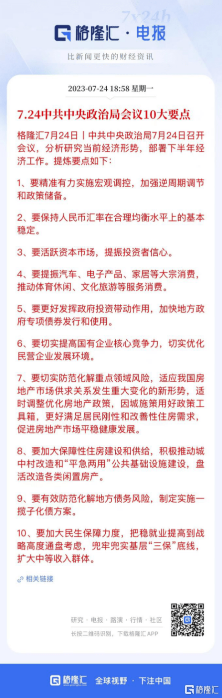 就在部分人还在观望时,中共中央政治局7月24日召开会议,分析研究当前经济形势,部署下半年经济工作。本次会议对国内经济形势、宏观调控政策、稳定人民币汇率、首提要活跃资本市场、促进地产平稳健康发展、化解地方债务风险、加大民生保障力度等多方面内容都做了精准判断和积极定调(具体10大要点内容如下图)