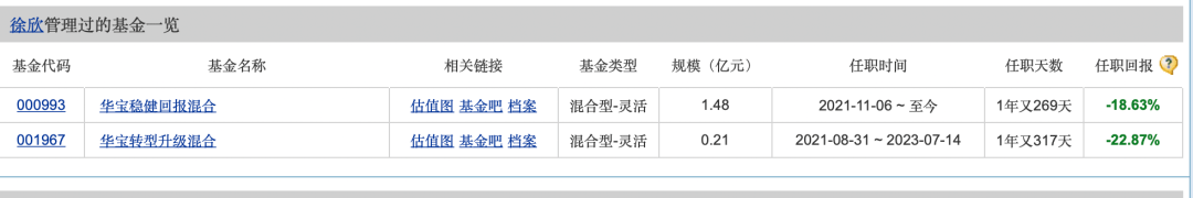 经徐欣管理的基金一共有2只,分别为华宝稳健回报混合和华宝转型升级混合,而在她任职期间,两只基金的回报率分别为-18.91%和-22.87%。