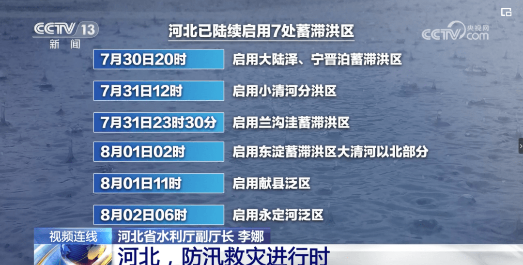 此次洪水涉及河北四个流域——大清河、永定河、子牙河和北运河。目前,河北省在永定河、大清河和子牙河三个河系共启用了七个蓄滞洪区。