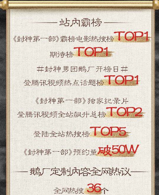 企鹅影视参与投资出品高品质院线内容,腾讯视频作为强势渠道,用好平台资源,通过整合营销的多种玩法,对《封神第一部》票房和口碑持续保驾护航,最终凭借六大独家策划活动、端内超20亿曝光资源、全网千万级受众覆盖等,多次冲击热搜榜(收获全网热搜36个);在抖音渠道播放量超3000万,同样爆款不断。
