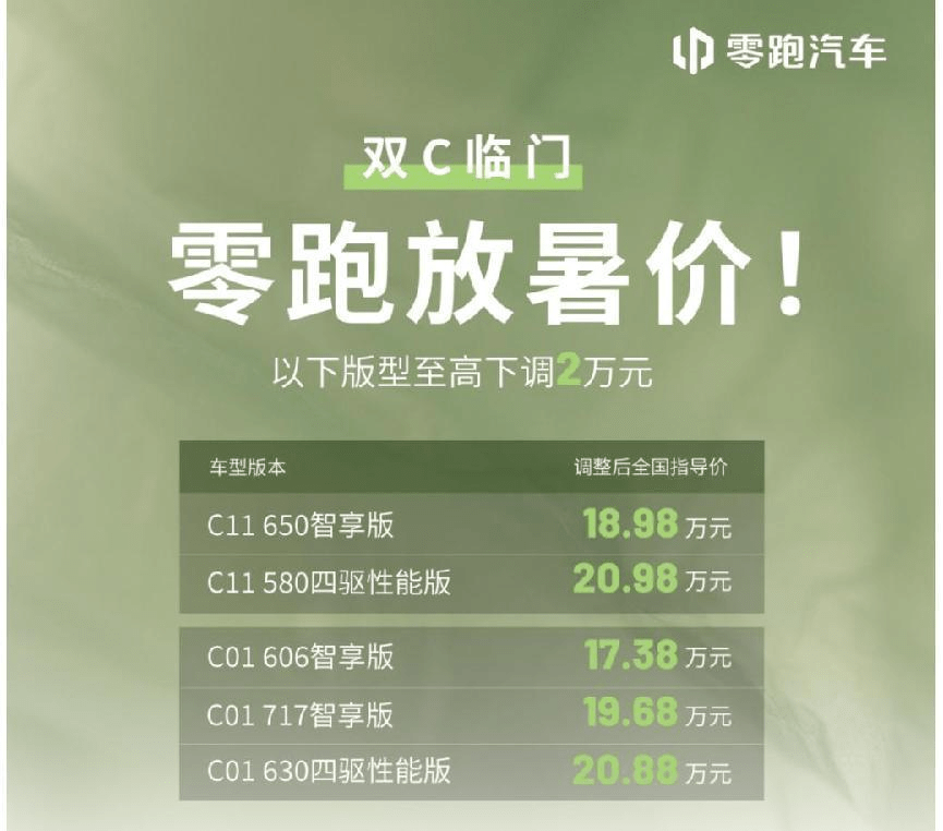 据了解,此次零跑汽车针对旗下C系列的两款热门车型C11以及C01的部分车型版本,进行了降价,最高降幅为2万元。售价范围最低是C01606智享版17.38万,最高是C11580四驱性能版20.98万元。